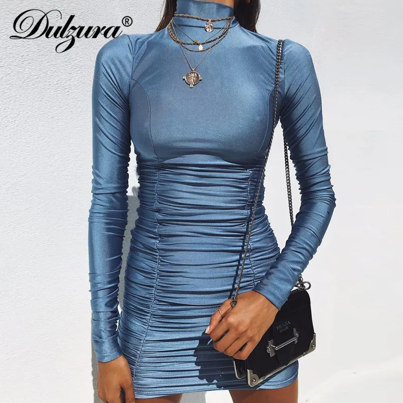 Best Dulzura women sexy bodycon mini dress 2019 autumn winter clothes long sleeve high neck smocking par