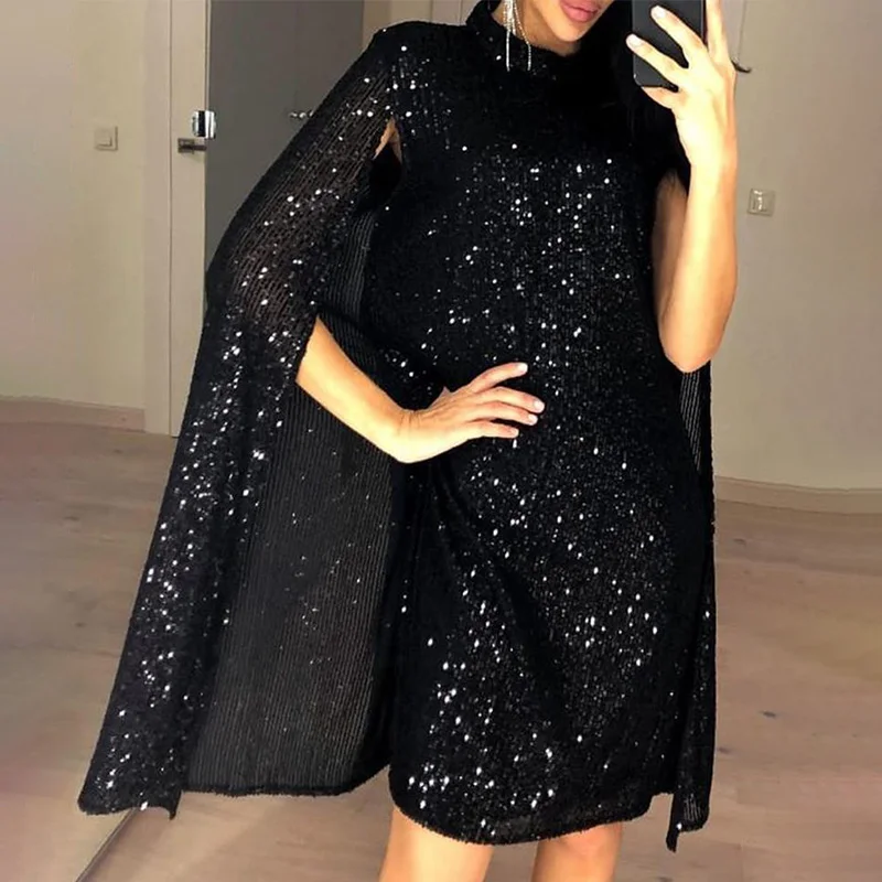 BEST Women's Sequined Party Midi Dress Cloak Sleeves Spring Dresses Female Summer Loose Elegant Fashion